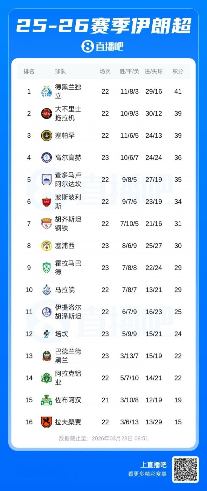 由于美伊冲突,2025-26赛季的伊朗联赛从今年2月以来一直暂停。伊朗足协秘书长海达特·蒙比尼表示,将根据目前联赛积分榜排名确定亚冠参赛球队。目前排在积分榜首位的德黑兰独立将获得下赛季的亚冠精英赛直接晋级资格,第二名大不里士拖拉机将参加亚冠精英赛的附加赛,而第三名塞帕罕将参加亚冠二级联赛。